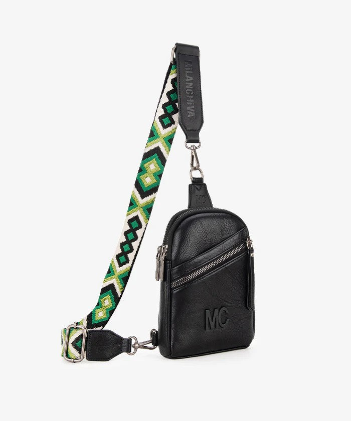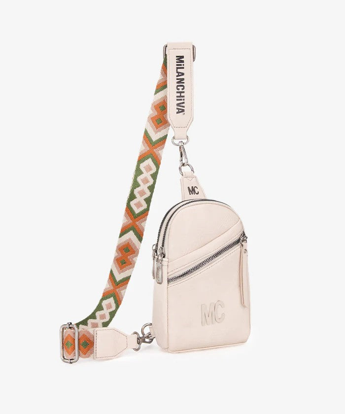 This Milan Chiva Aztec Sling Bag combines sleek design with everyday practicality. Crafted from vegan leather, the sling bag features a top zipper closure and a back zipper pocket for secure and convenient storage.