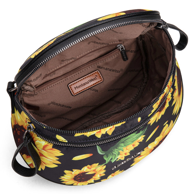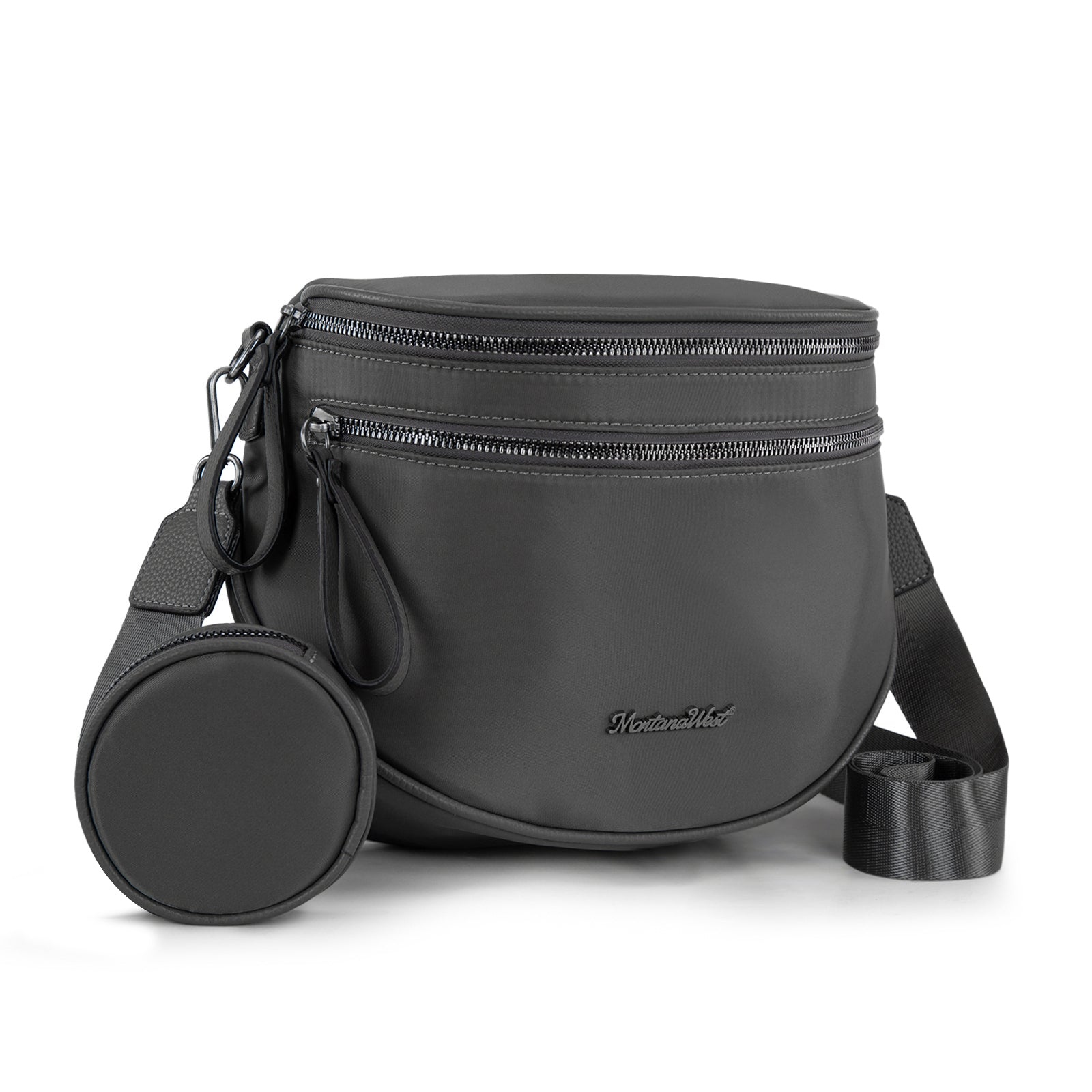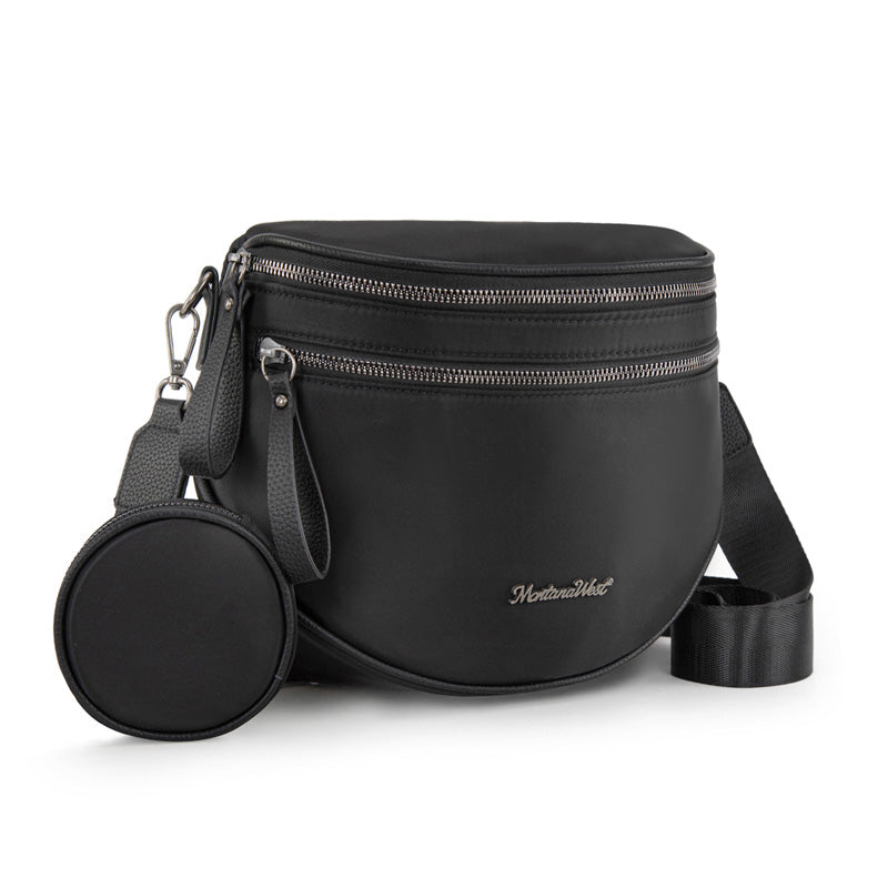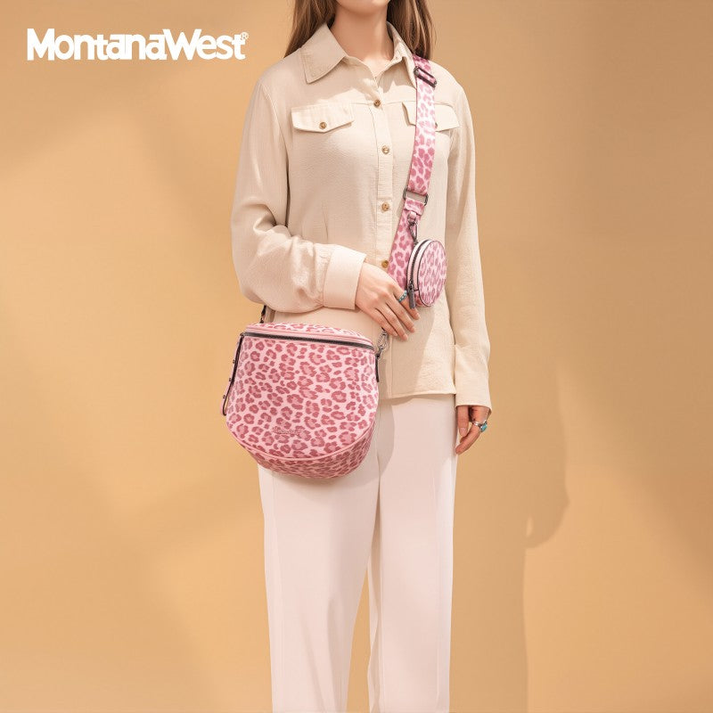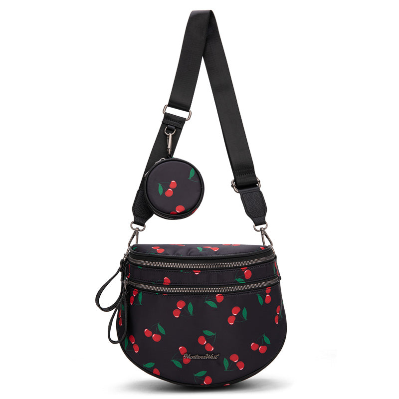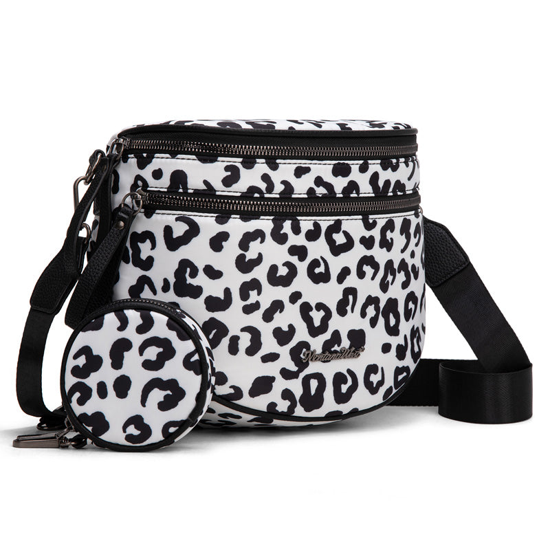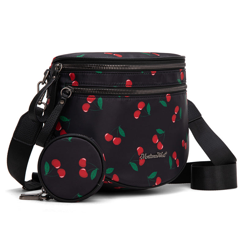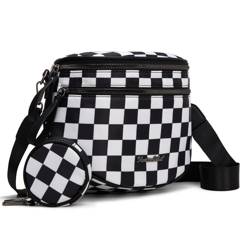 This Montana West crossbody bag is crafted from Nylon Fabric/Vegan leather with dual zip compartments and a matching coin purse. This fanny pack is perfect for hands-free style and carrying on-the-go essentials. Available in multiple colors, including bold black-and-white leopard print and checkerboard, Sunflower florals, and more to match any outfit