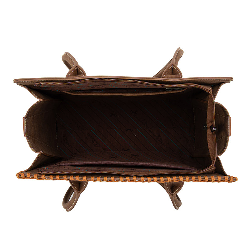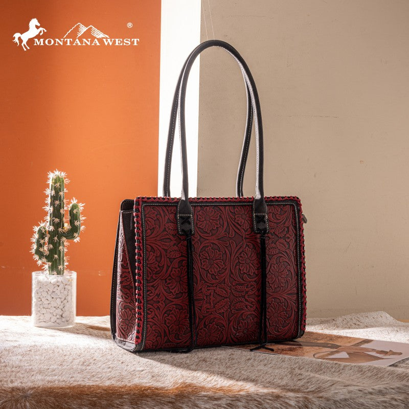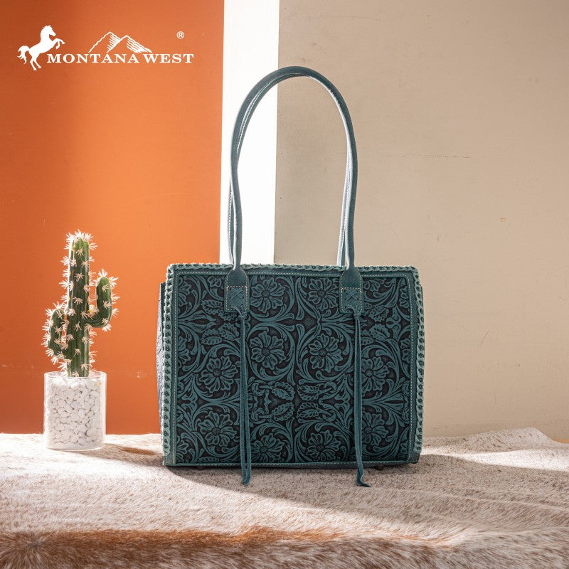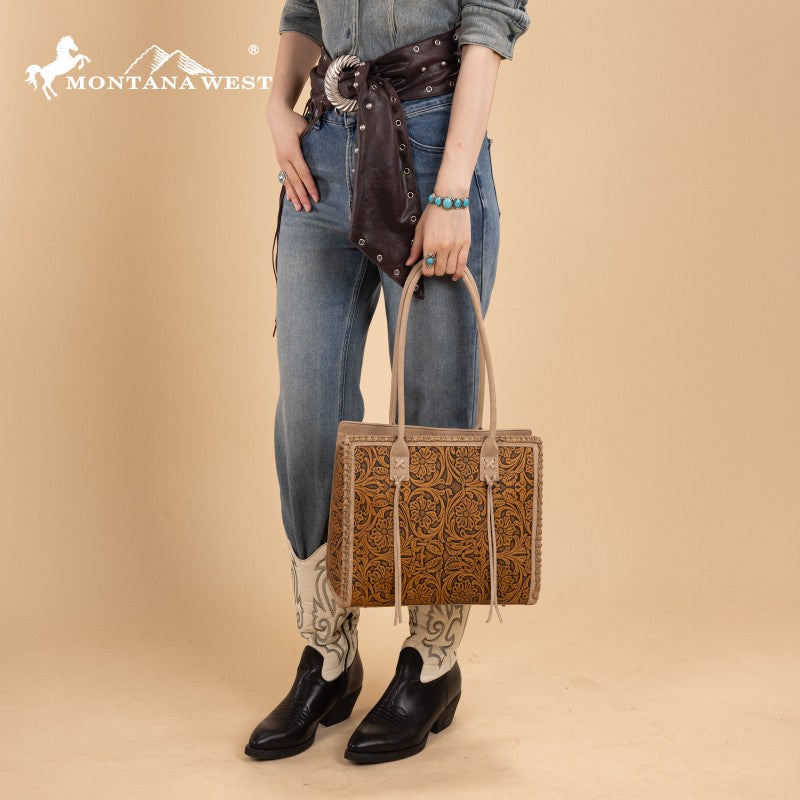 The Montana West Floral Tool Tote Bag merges rugged durability with Western elegance, designed for women who value both style and practicality. Crafted from durable synthetic leather, this leather tool tote bag features an embossed floral pattern, decorative whipstitching, and a playful fringe tassel accent that captures the Western flair.