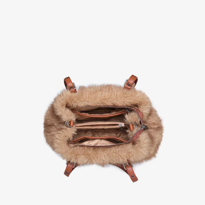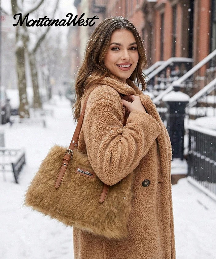 The Montana West plush faux fur bag blends plush texture and rustic charm for standout style. Crafted from soft brown faux fur with synthetic leather trim, it features a rounded silhouette, adjustable shoulder straps, and buckle accents.