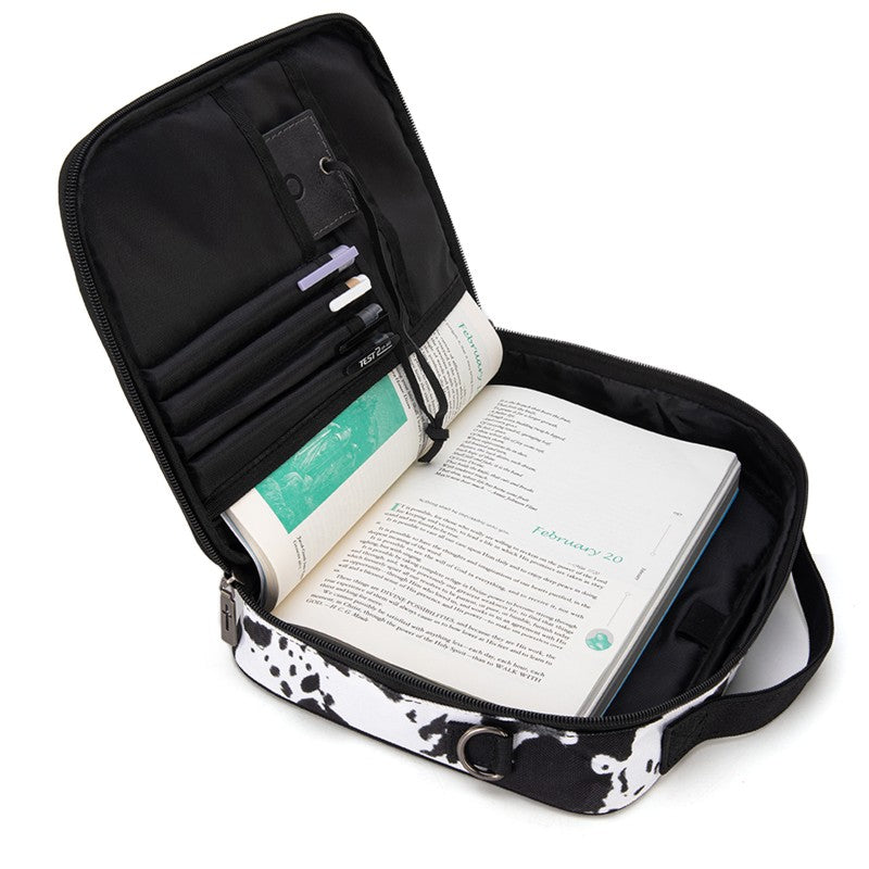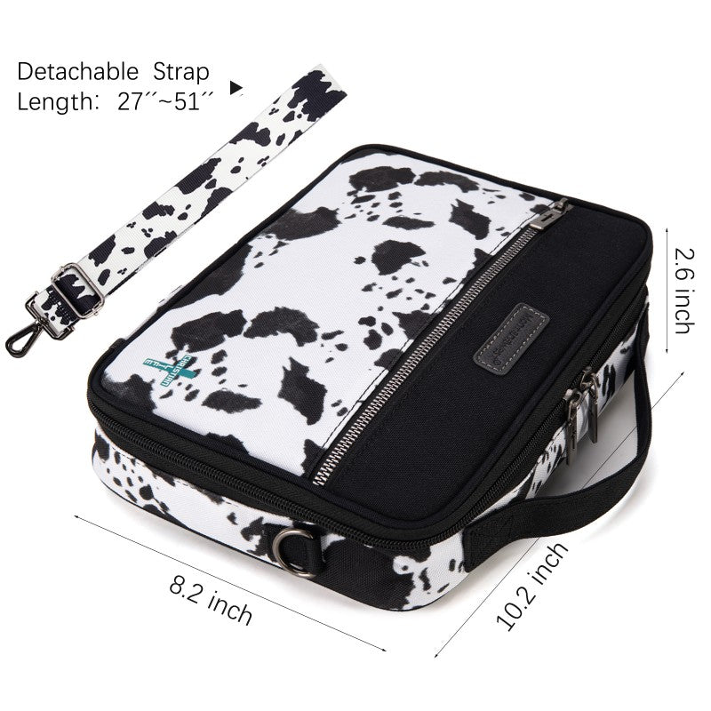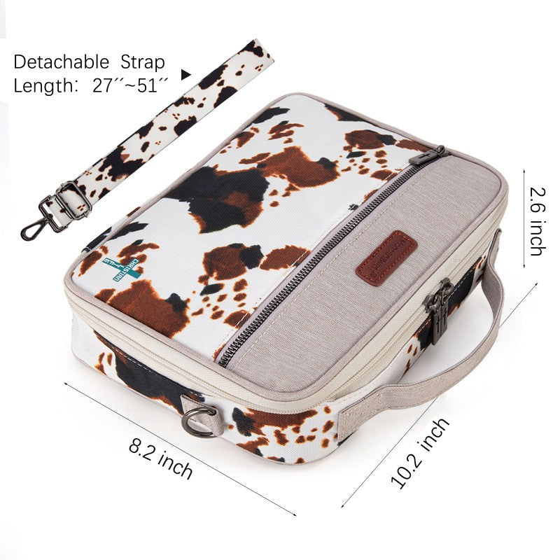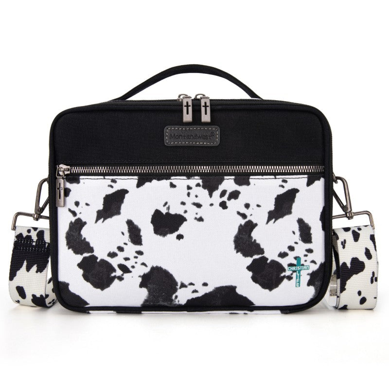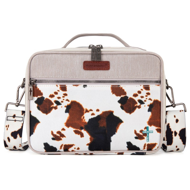 Carry your Bible in true Western style with this Montana West Bible Cover, featuring rustic cowboy print, steer head, cowprint, and Aztec patterns in earthy tones. The Western bag has a double zipper, a front pocket, pen holders, and extra space for notes and accessories. Includes a built-in bookmark strap to mark your page and keep your Bible secure, Designed for easy carrying to church, study groups, or travel, this Western Bible case fits most standard Bibles, devotionals, and journals.