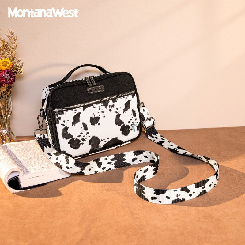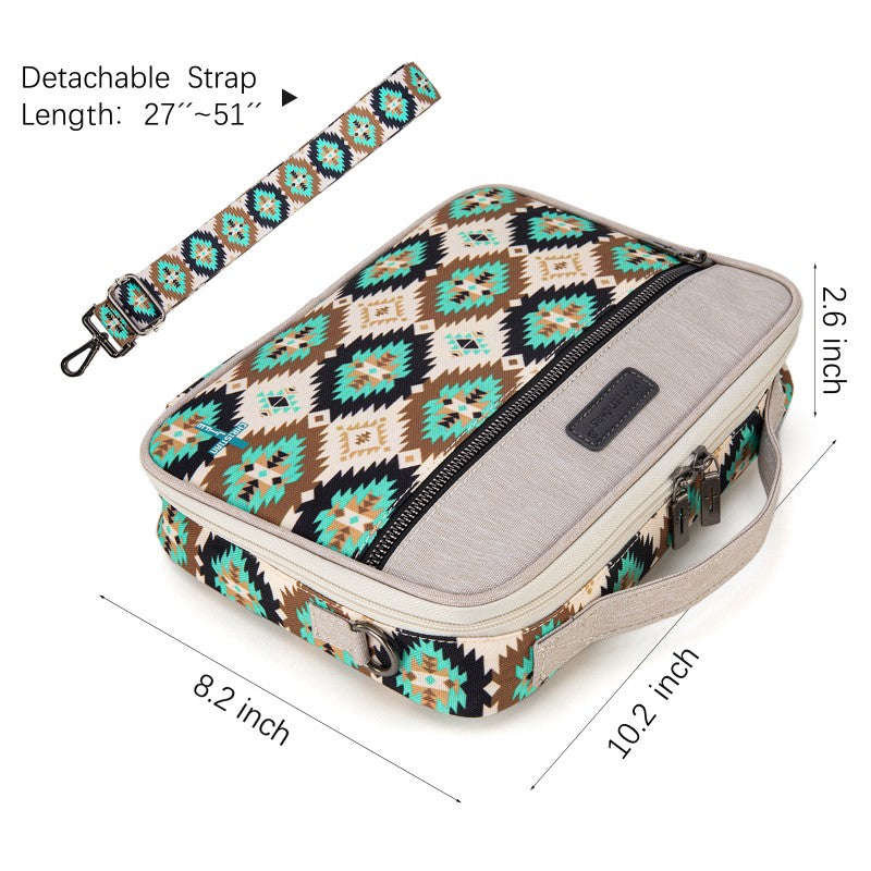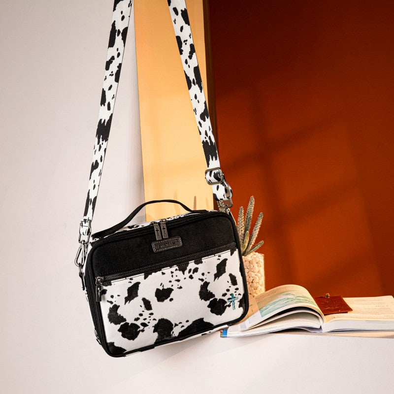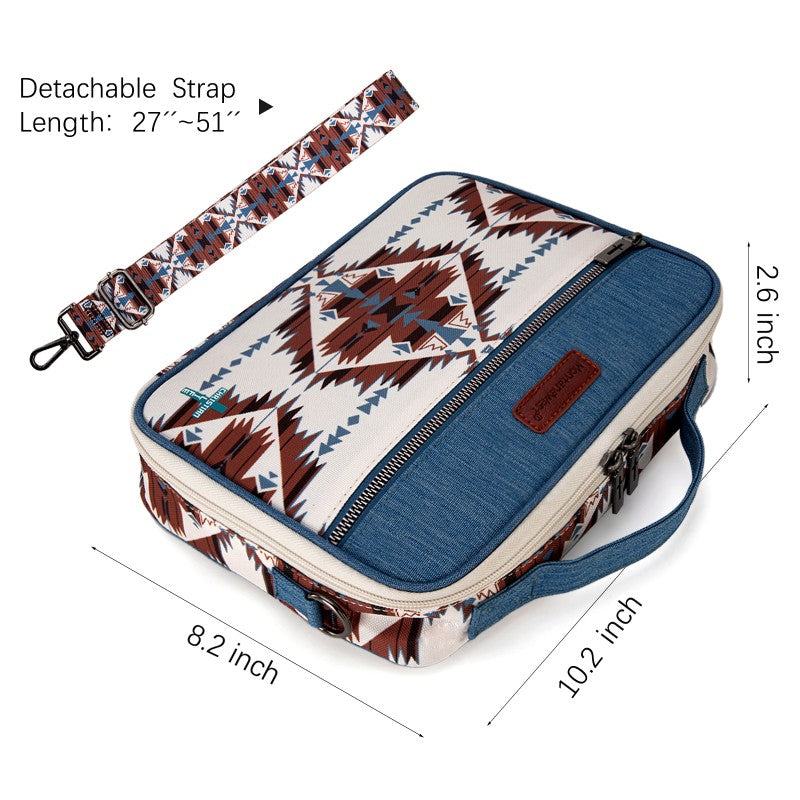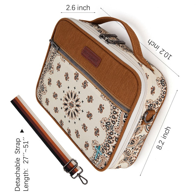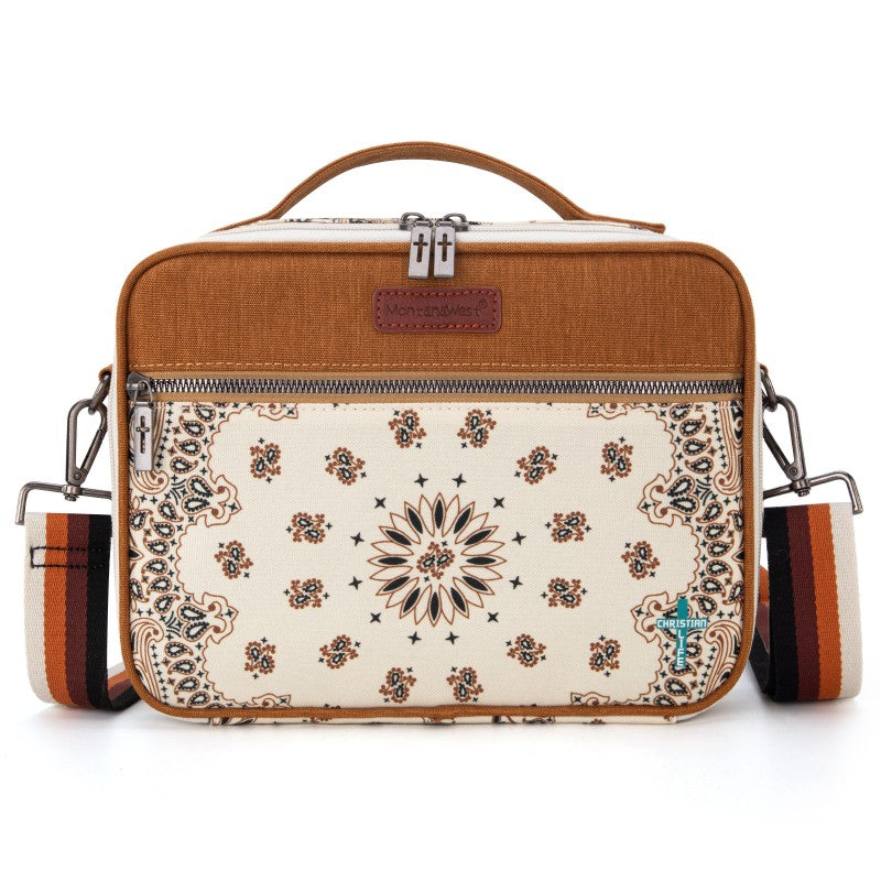 Carry your Bible in true Western style with this Montana West Bible Cover, featuring rustic cowboy print, steer head, cowprint, and Aztec patterns in earthy tones. The Western bag has a double zipper, a front pocket, pen holders, and extra space for notes and accessories. Includes a built-in bookmark strap to mark your page and keep your Bible secure, Designed for easy carrying to church, study groups, or travel, this Western Bible case fits most standard Bibles, devotionals, and journals.