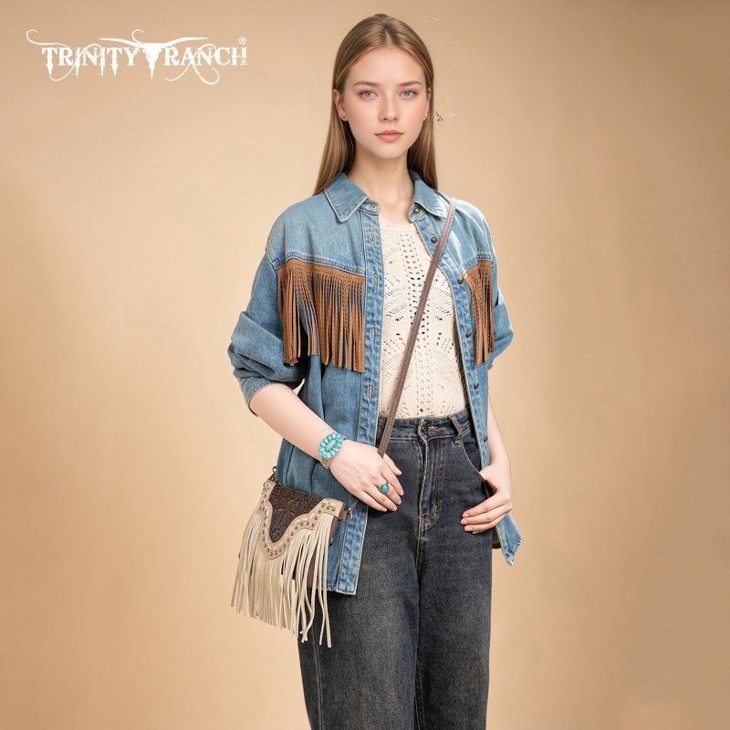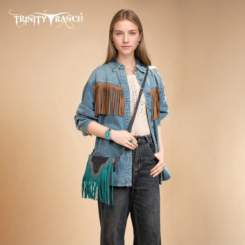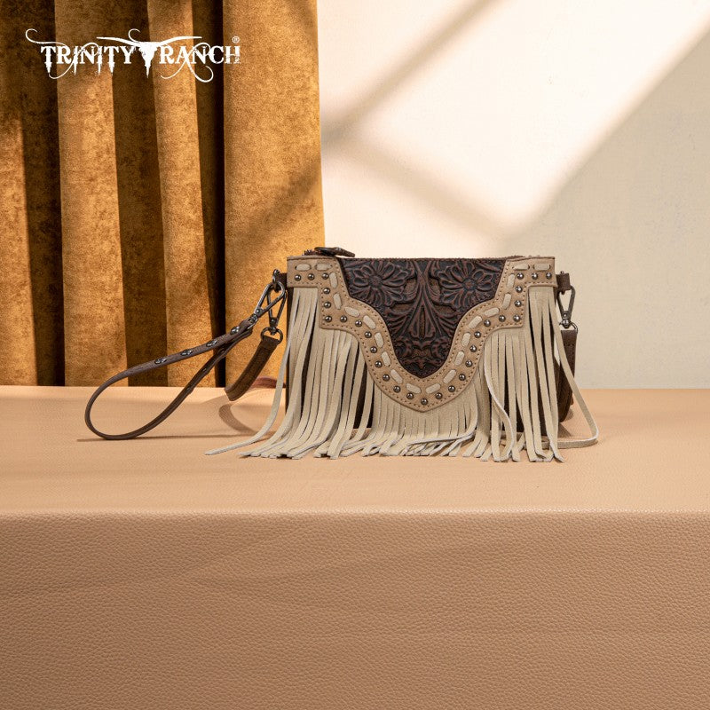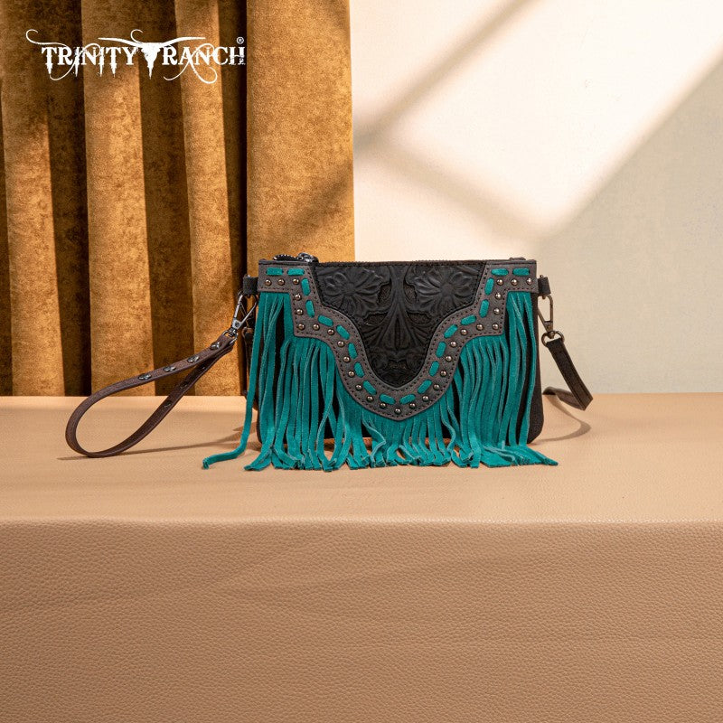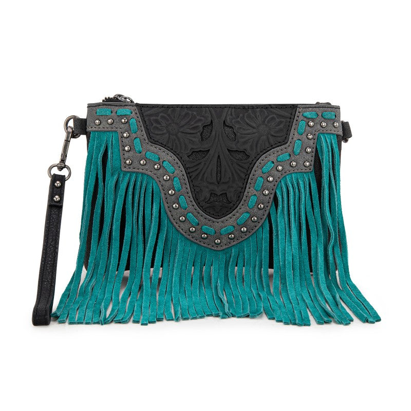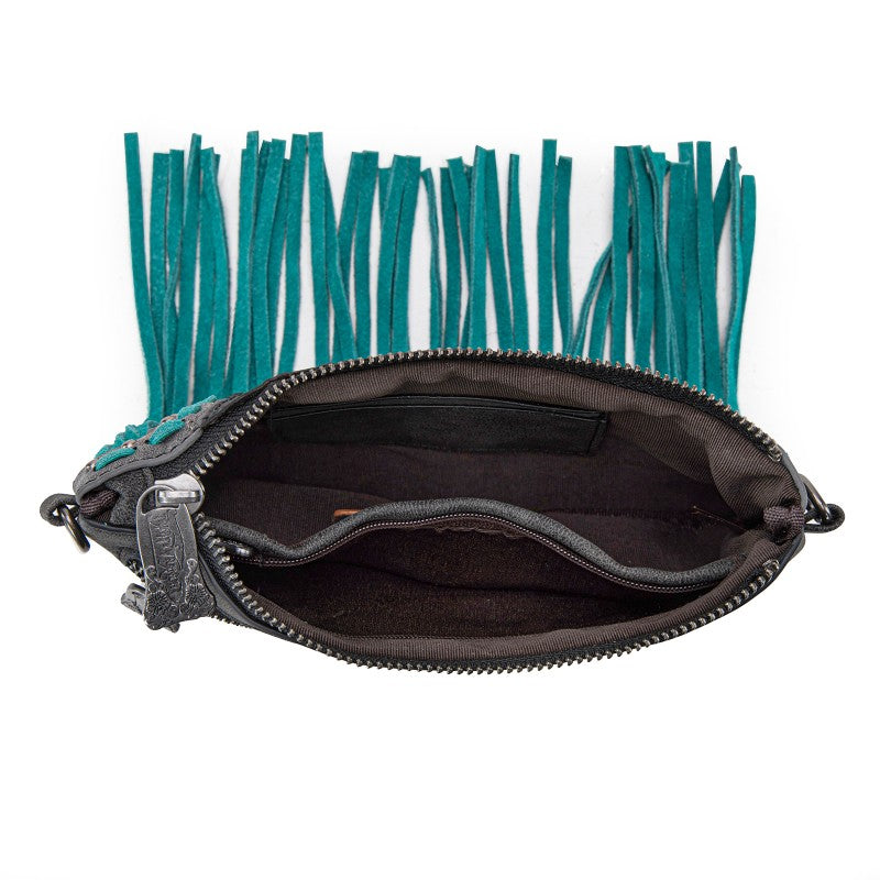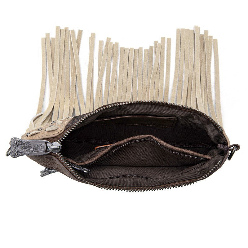 Trinity Ranch line by Montana West, this partial genuine leather clutch/crossbody has: