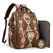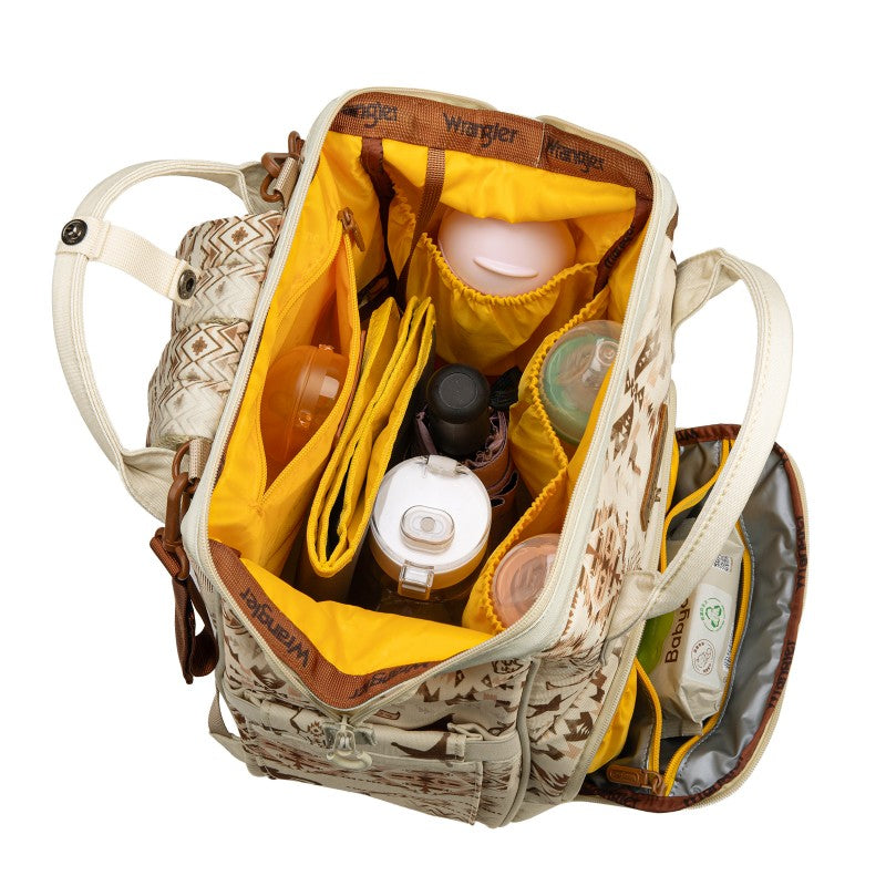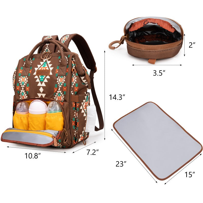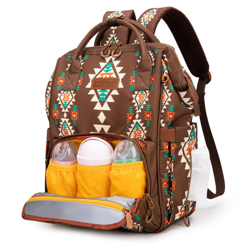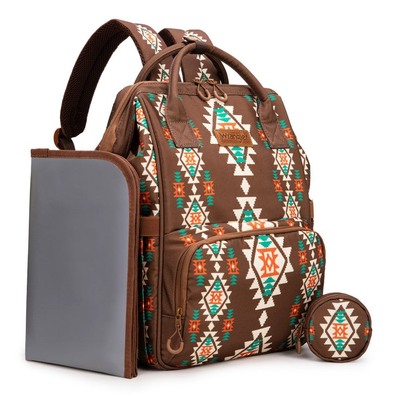 The Wrangler backpack diaper bags combine rugged style and smart functionality for modern parents. Designed with durable canvas, this bag features a geometric tribal pattern and a detachable pouch for quick-access essentials.