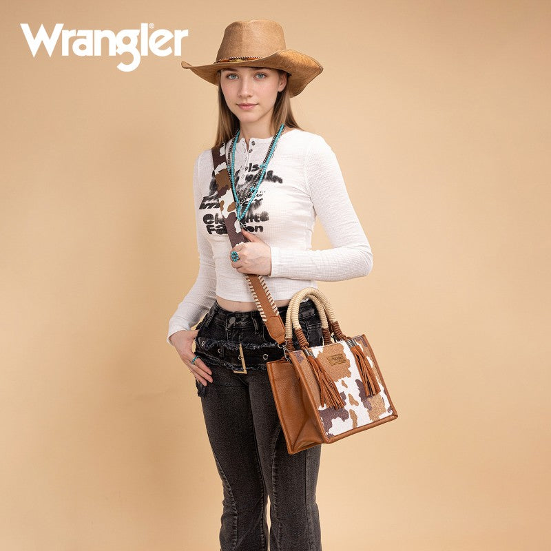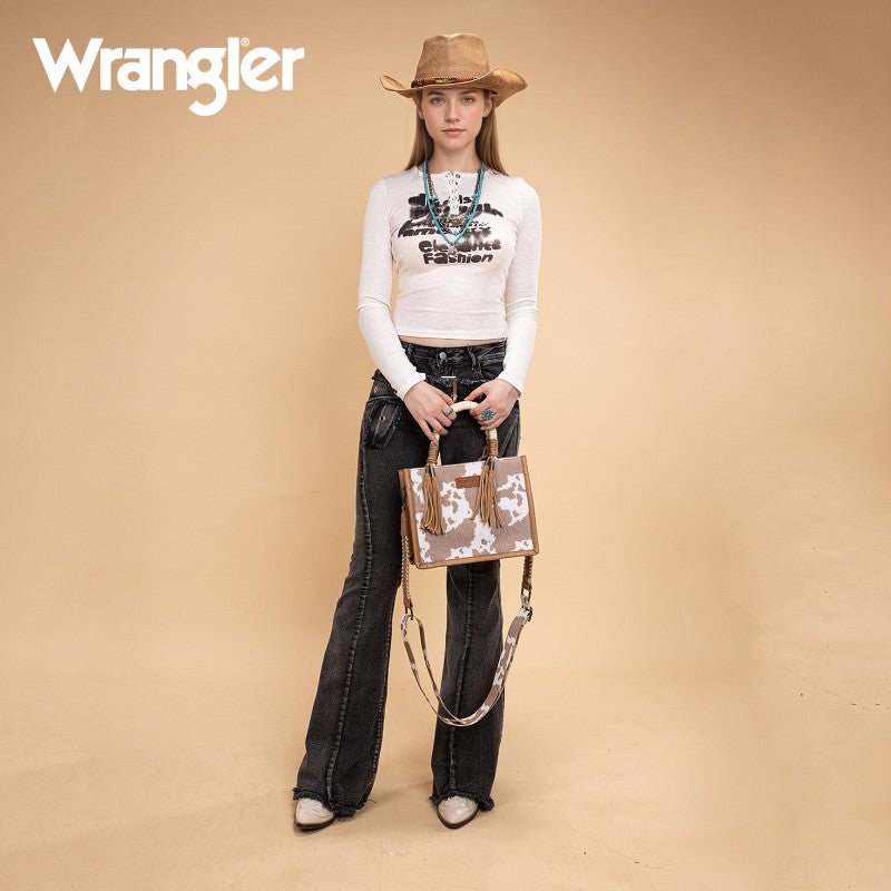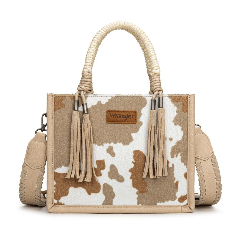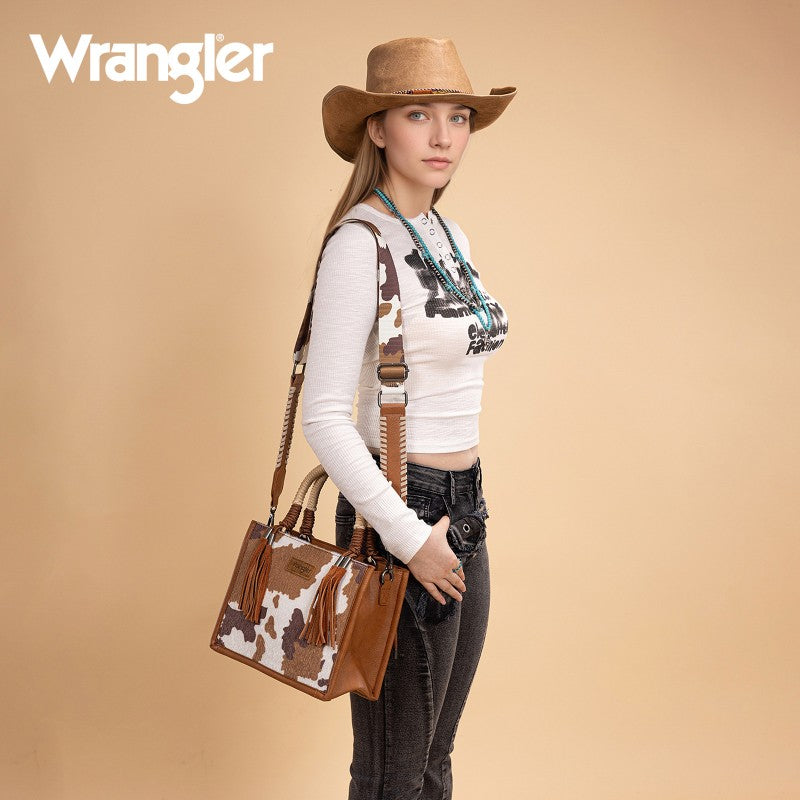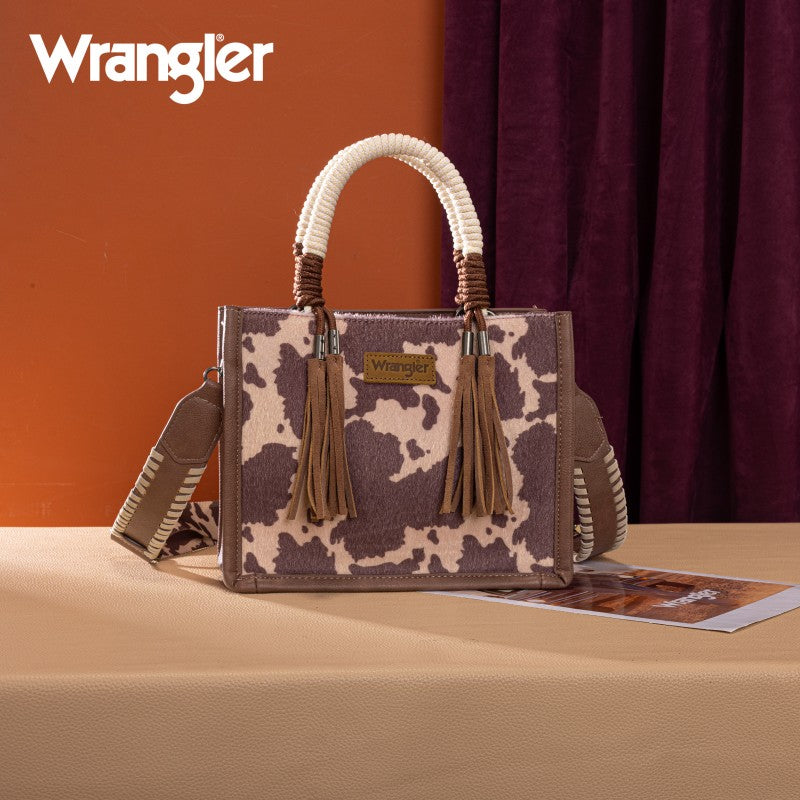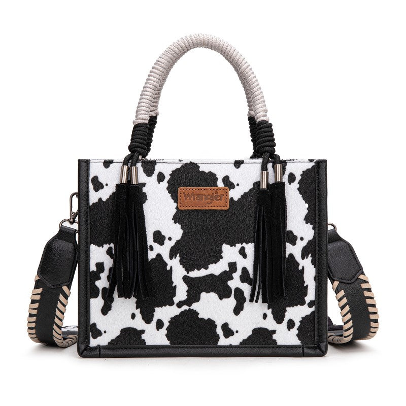Saddle up for standout style with the Wrangler Tote Bag. This eye-catching western purse features a bold cowprint, a sturdy woven rope handle, and traditional whipstitch detailing with playful leather tassels. The adjustable strap offers versatile carry—handheld, shoulder, or crossbody. Rugged, functional, and unmistakably Western, this western purse blends ranch-ready charm with modern versatility