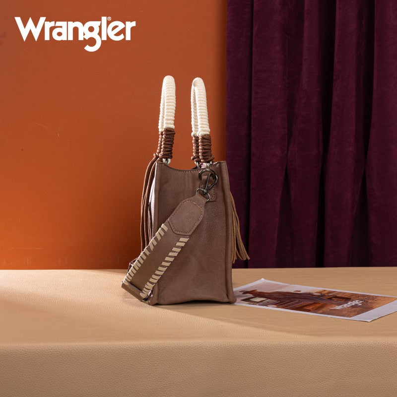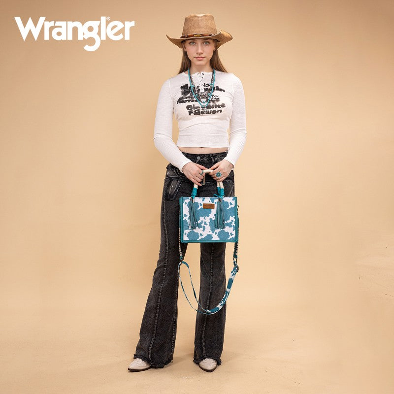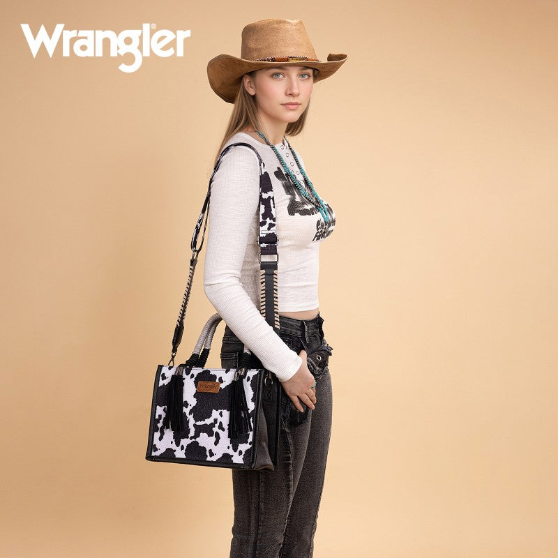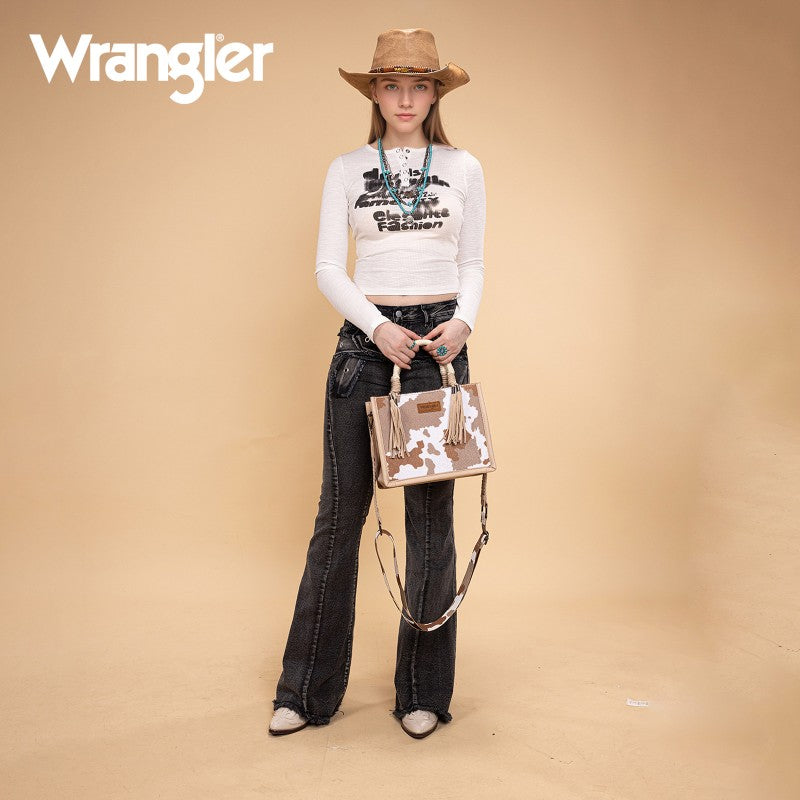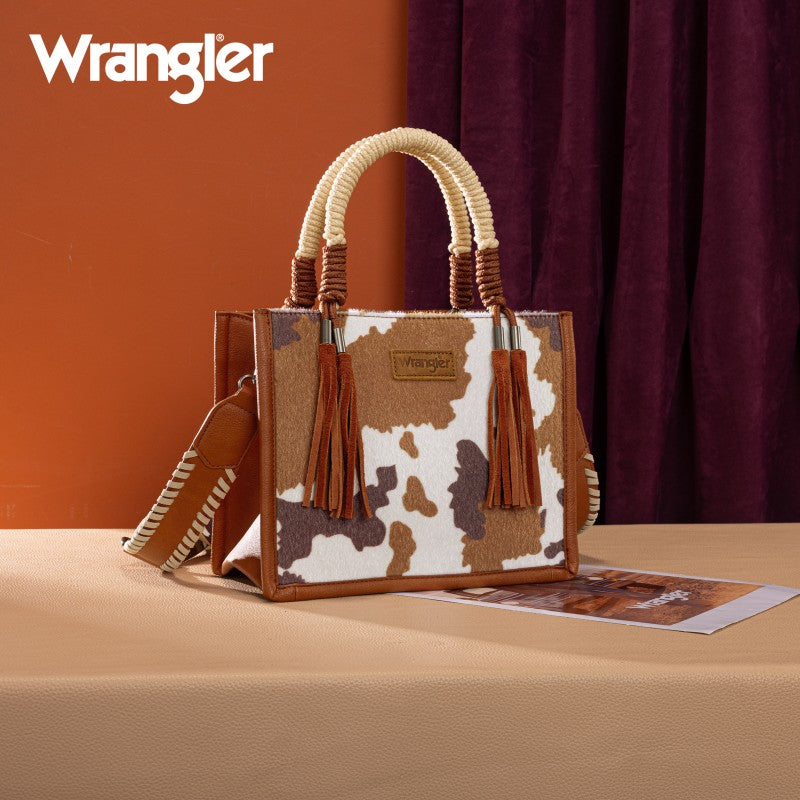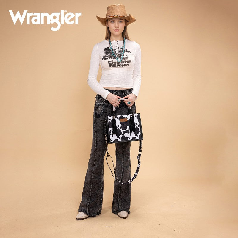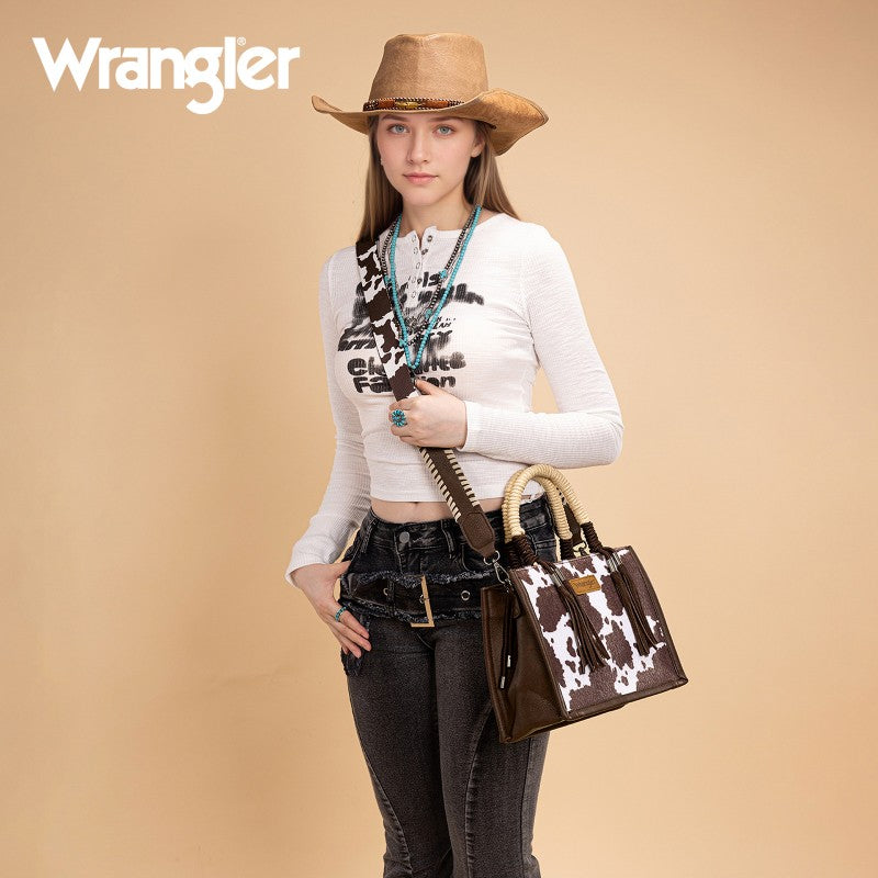 Saddle up for standout style with the Wrangler Tote Bag. This eye-catching western purse features a bold cowprint, a sturdy woven rope handle, and traditional whipstitch detailing with playful leather tassels. The adjustable strap offers versatile carry—handheld, shoulder, or crossbody. Rugged, functional, and unmistakably Western, this western purse blends ranch-ready charm with modern versatility