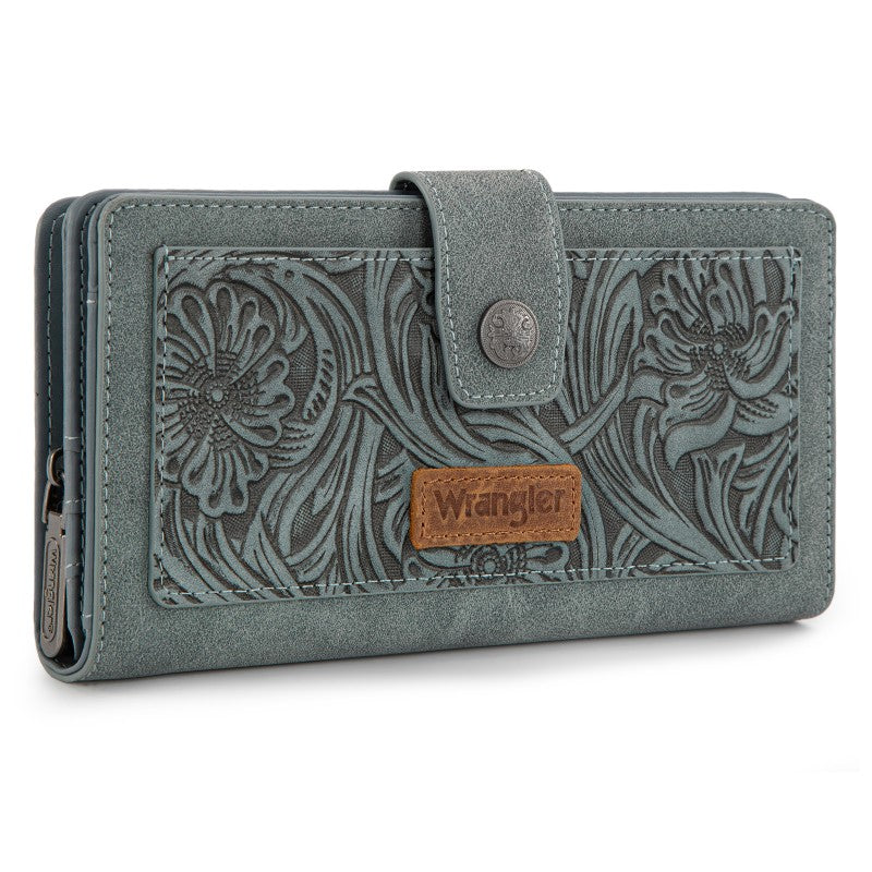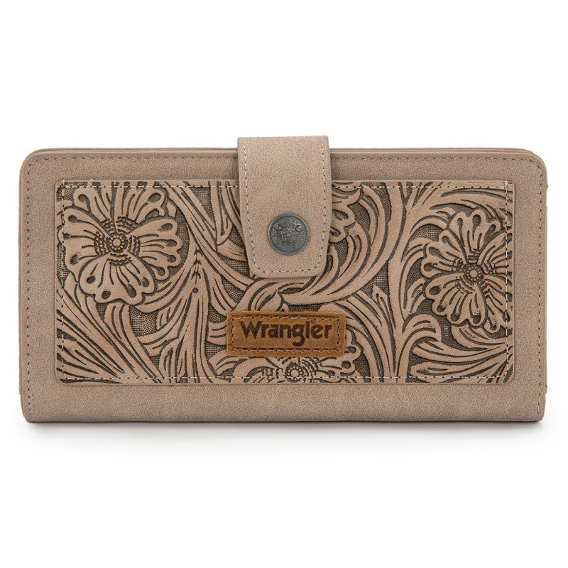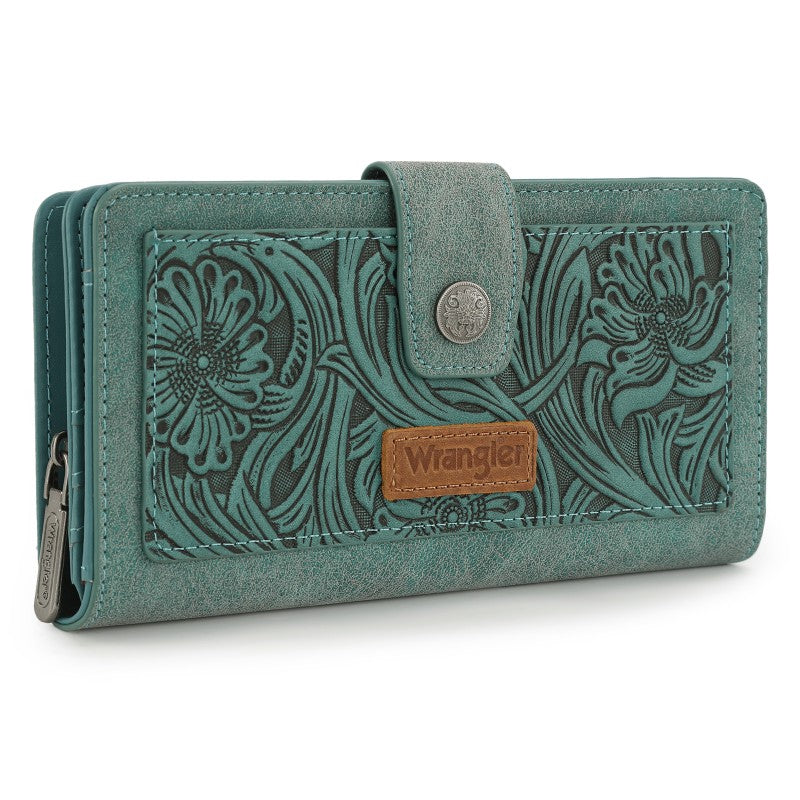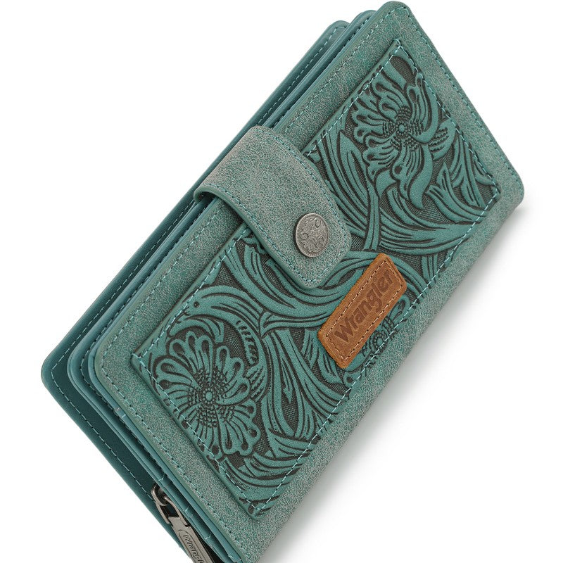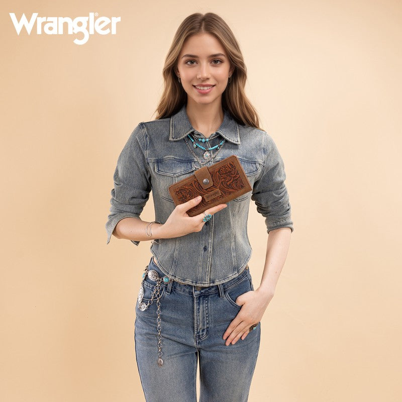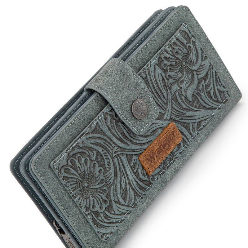 The Wrangler floral bifold wallet combines Western charm with modern function. Crafted from synthetic leather, this floral wallet features an embossed floral pattern and RFID protection for security.