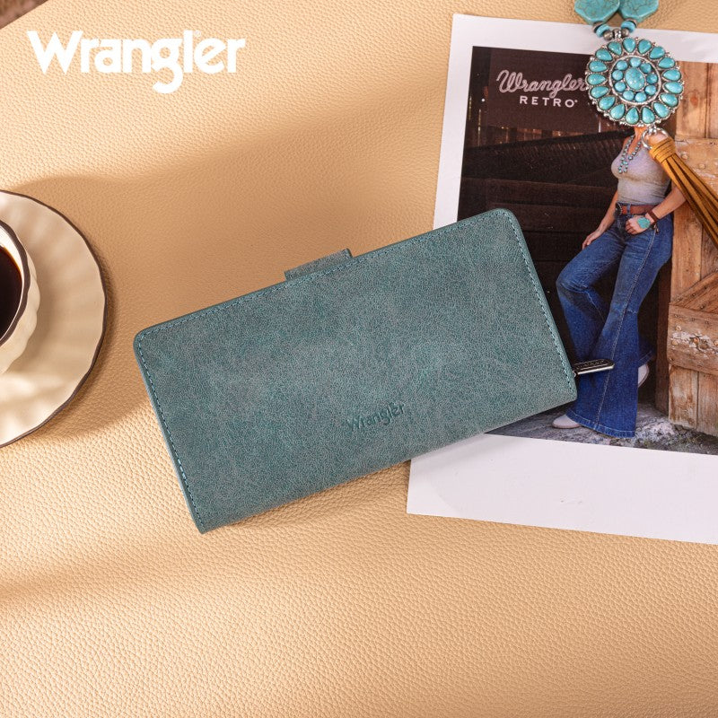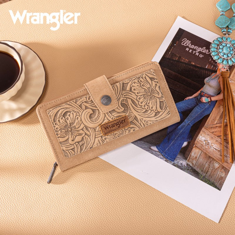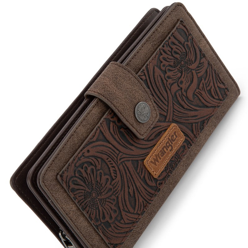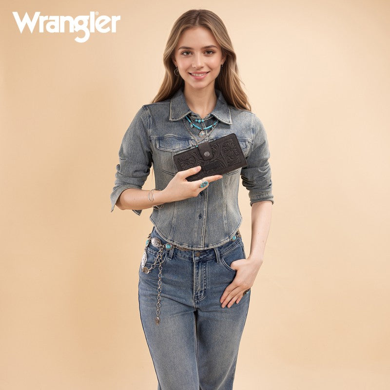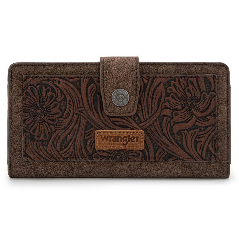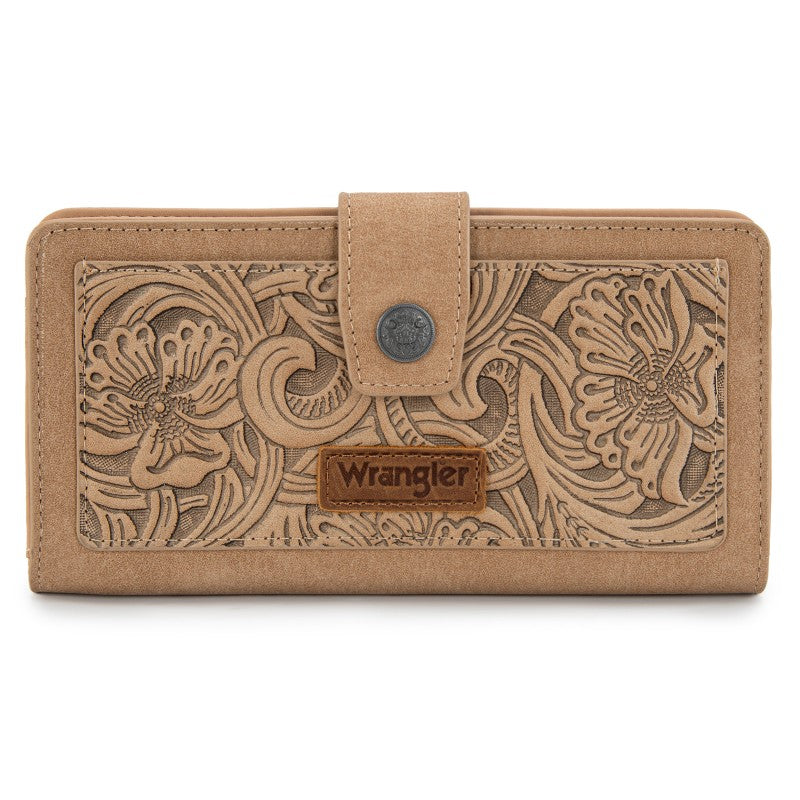 The Wrangler floral bifold wallet combines Western charm with modern function. Crafted from synthetic leather, this floral wallet features an embossed floral pattern and RFID protection for security.