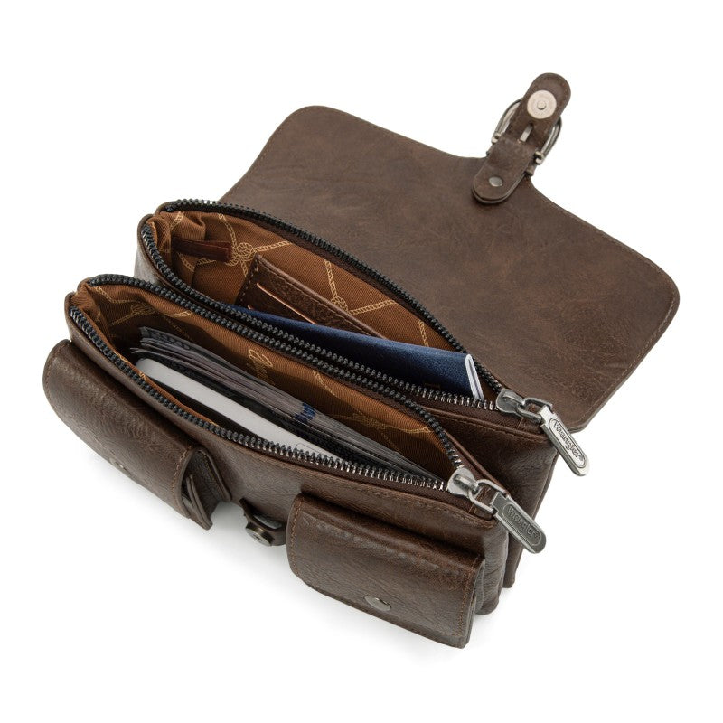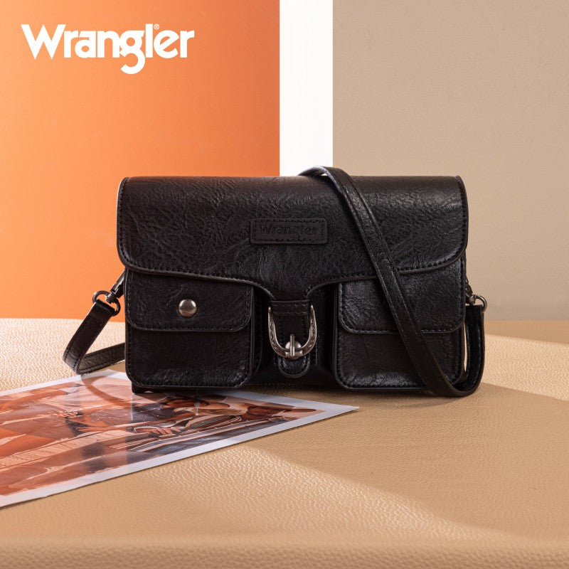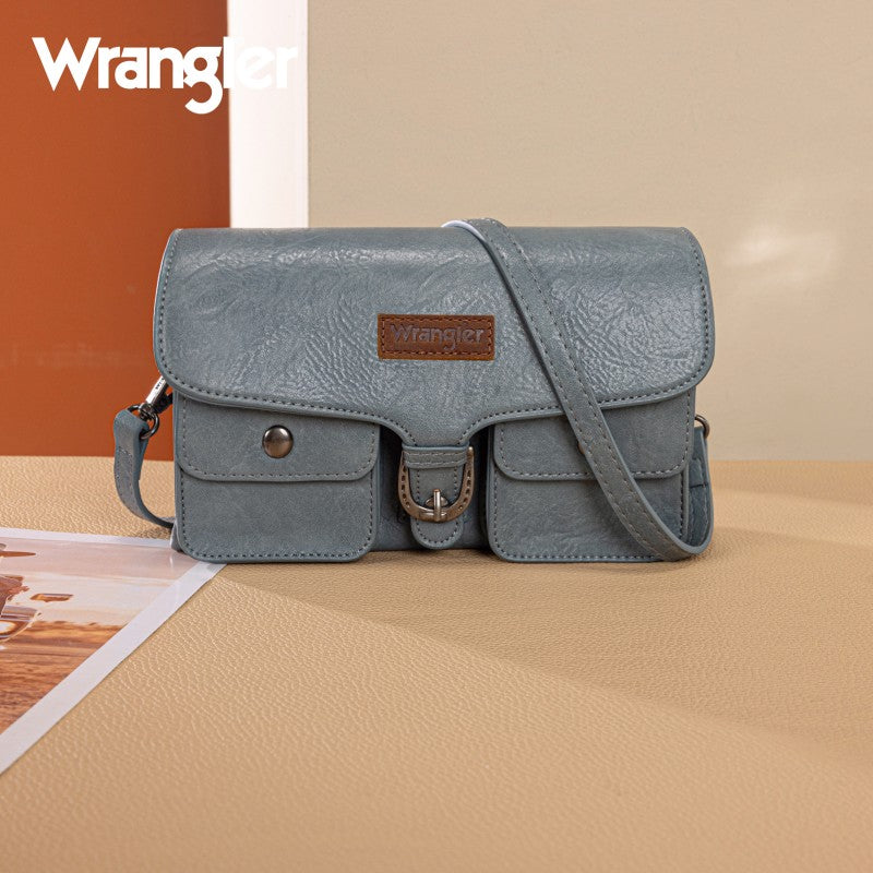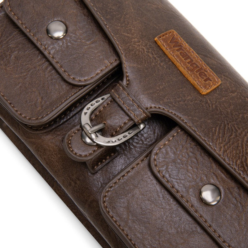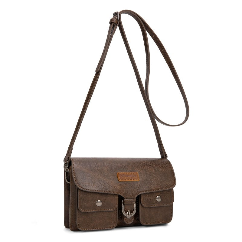 This Wrangler crossbody showcases a classic brown leather design. It features a unique buckle closure and two front pockets with snap buttons, adding both style and functionality. The adjustable strap allows for comfortable wear, making it perfect for daily use. Whether you're going to work or hanging out with friends, this bag combines fashion and practicality seamlessly.
