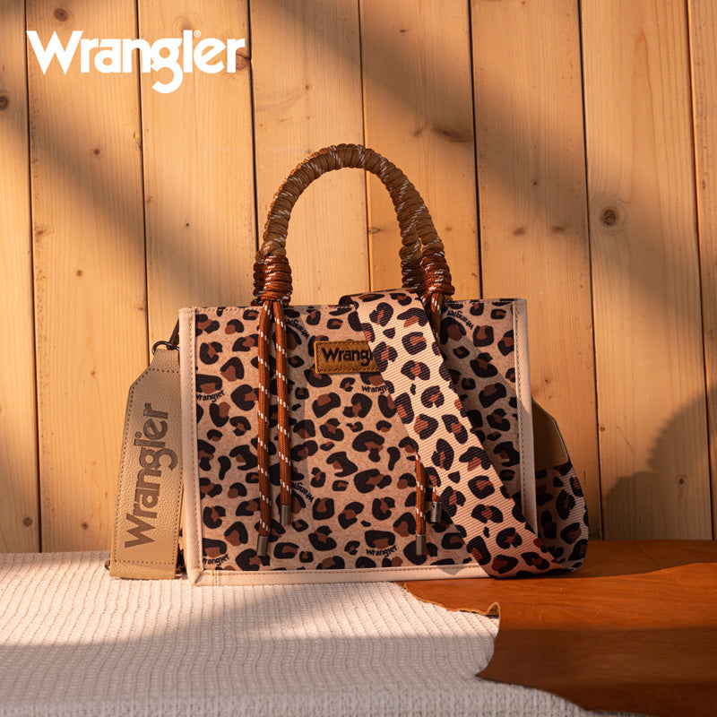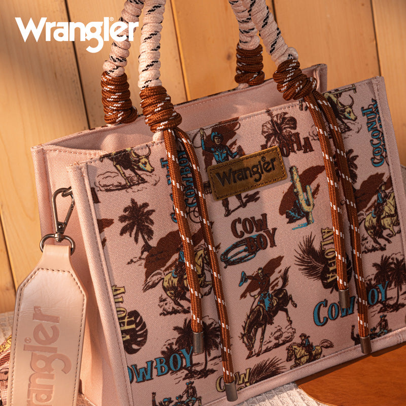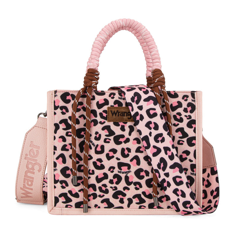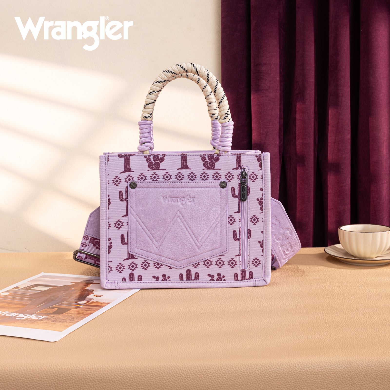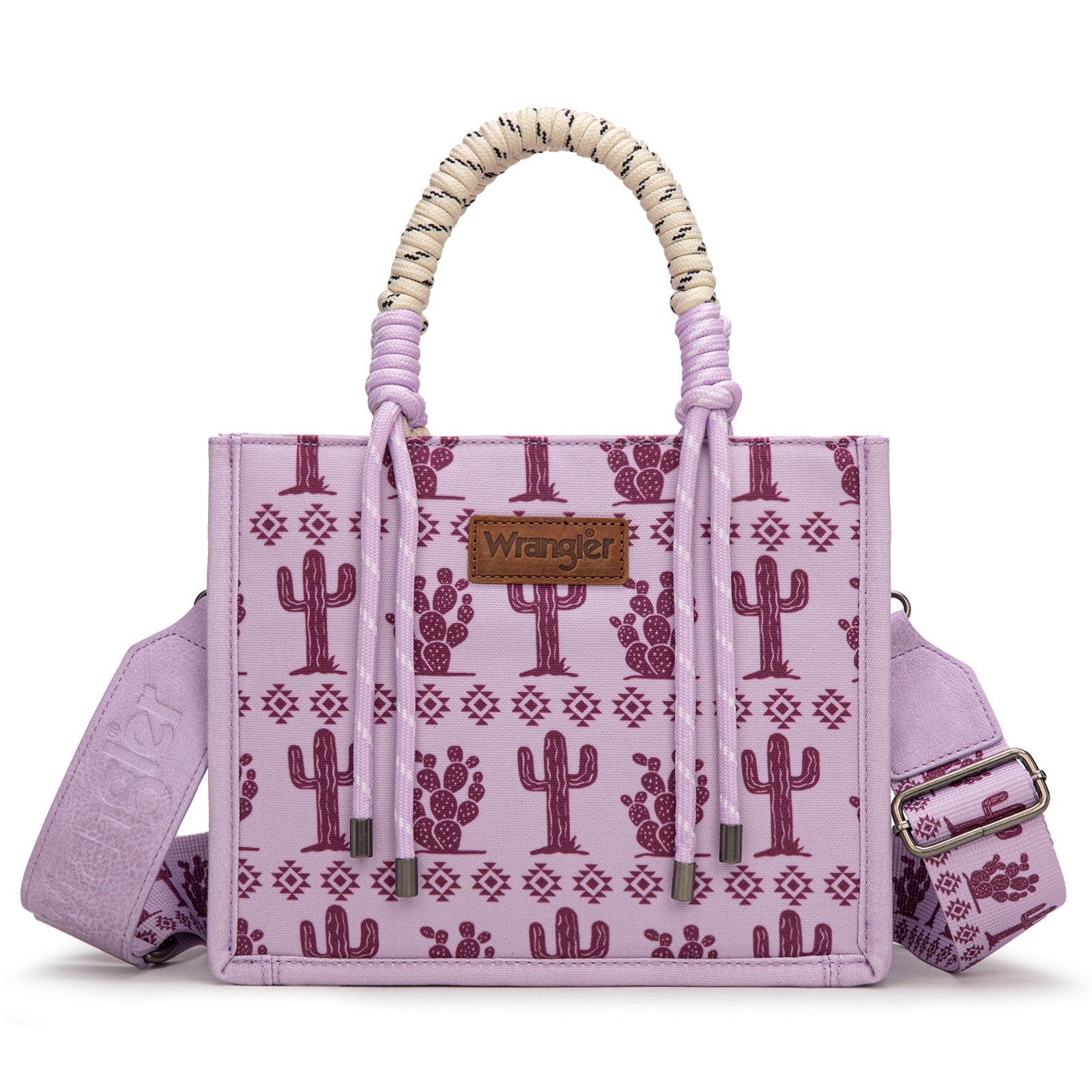 Canvas construction featuring an all-over cowboy/Aztec-inspired cactus and leopard print design, whipstitch details
